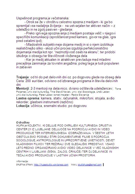 AVDIO-VIDEO DELAVNICA ZA MLADINO Končni izdelek: https://hupastudio.wordpress.com/2012/03/12/cmc-vizija/ Deli:Deli Click to share on X (Opens in new window) X Click to share on Facebook (Opens in new window) Facebook Click to share on LinkedIn (Opens in new window) LinkedIn Všeč mi je Nalaganje ...